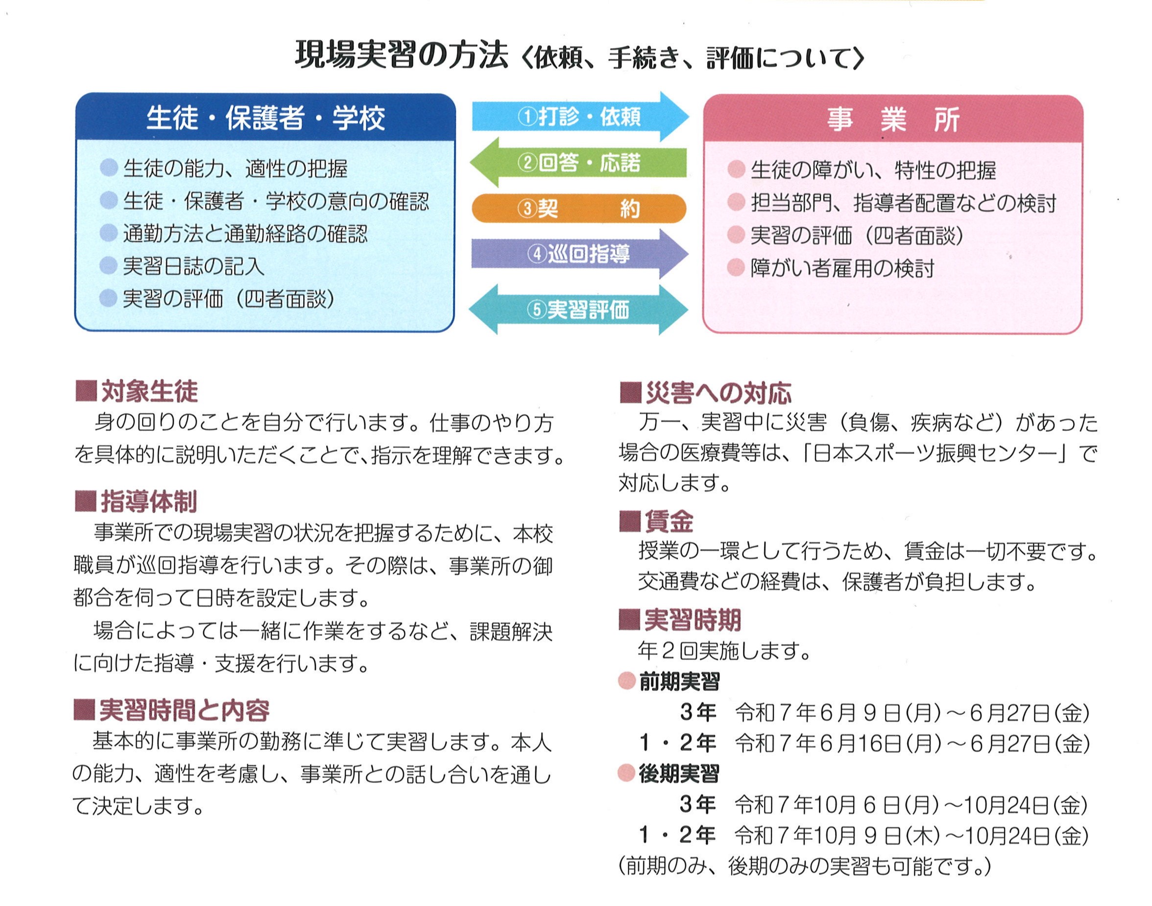 職業の学習で身に着けた「働く力」を現場で発揮し、成果と課題を振り返りながら職業人として望ましい勤労態度やコミュニケーションの取り方を学び、現場や働く生活に必要な力を身に着けることをねらいとしています。